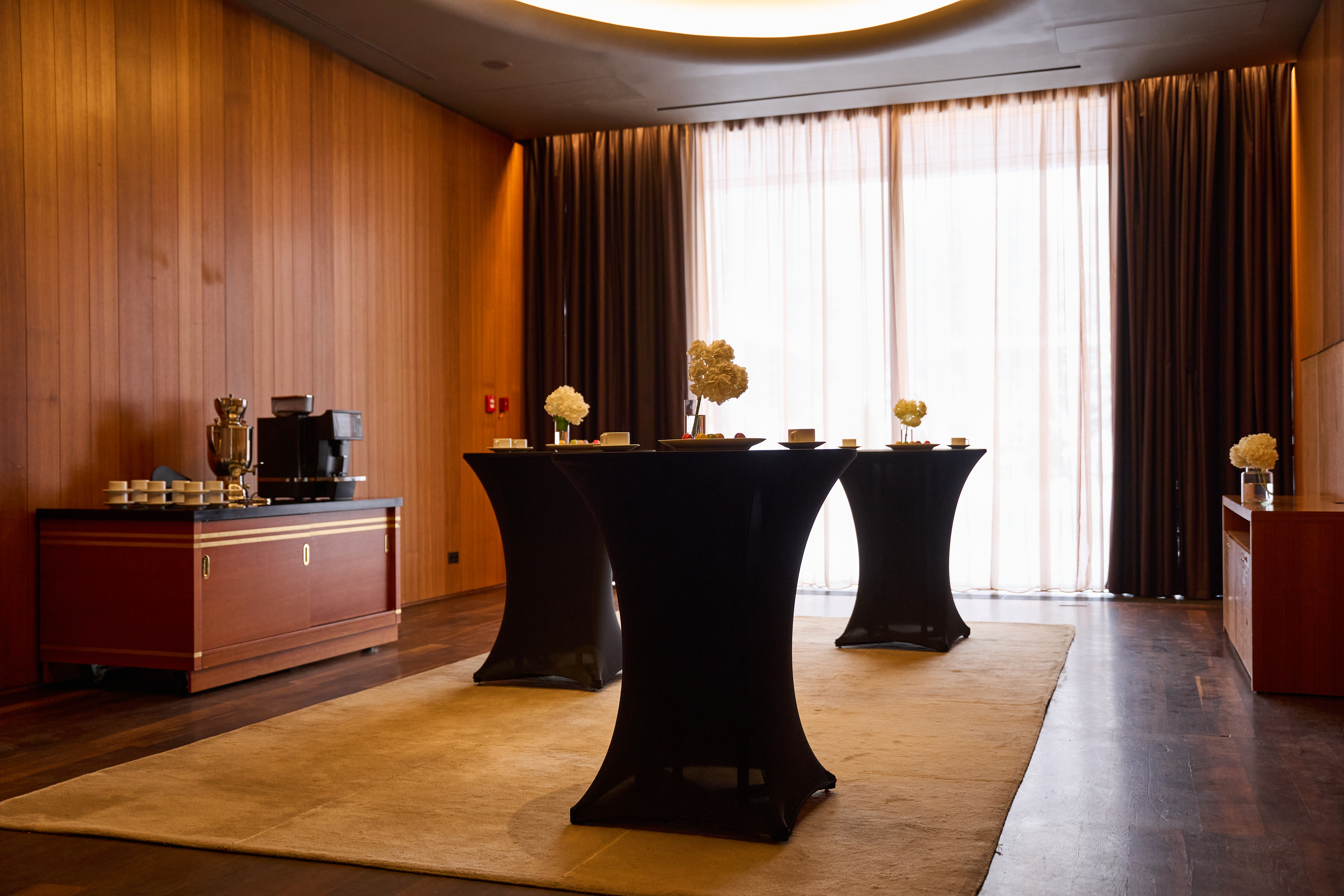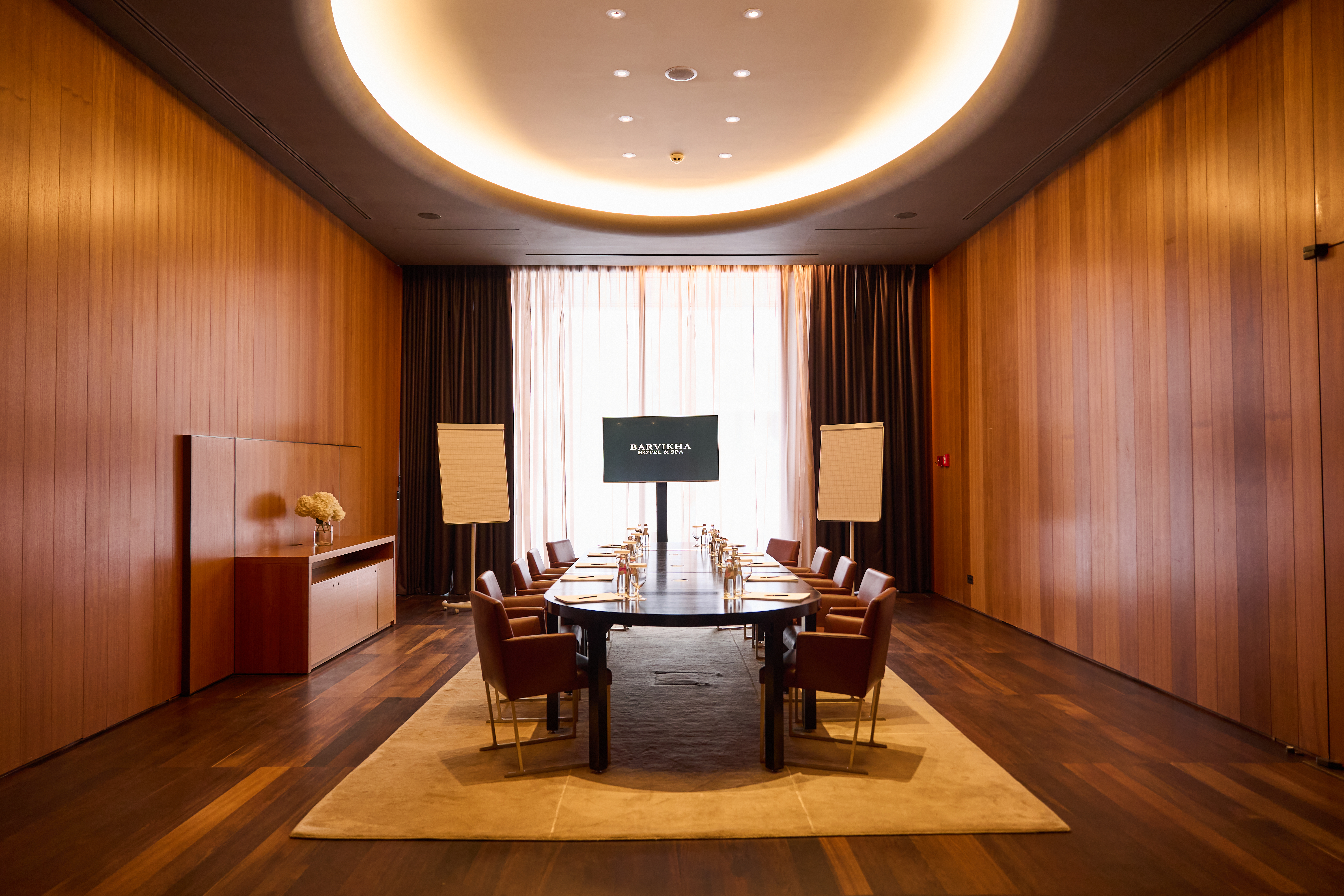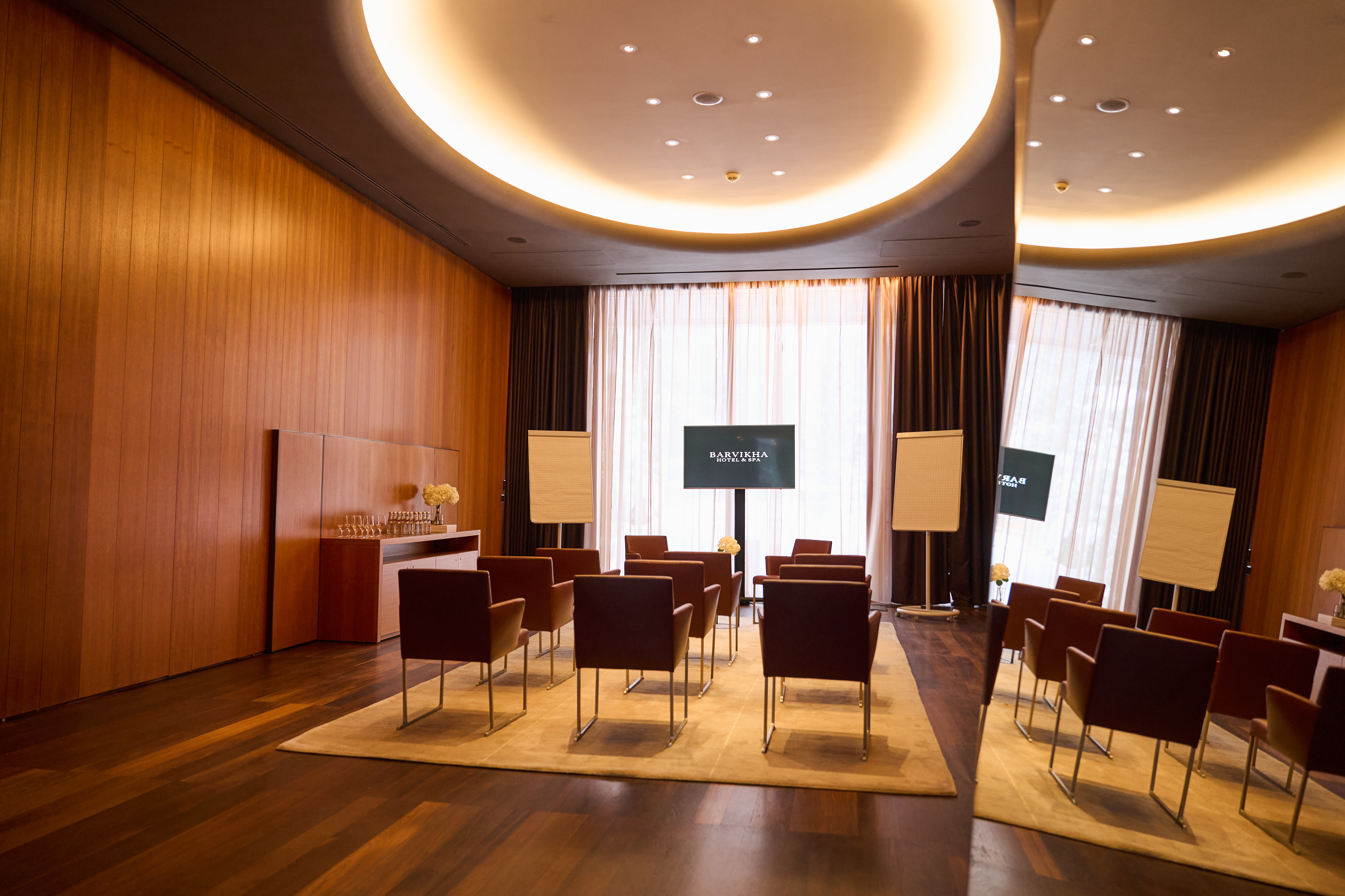 Barvikha Hotel & Spa располагает двумя смежными конференц-залами Rolex (65 м2) и Patek Philippe (65 м2). Они рассчитаны на мероприятия до 30 человек. Залы по желанию гостей могут быть полностью изолированы или объединены дверным проемом. Они имеют панорамные окна и выход на приватную террасу, где можно организовать лаундж-зону или фуршет.